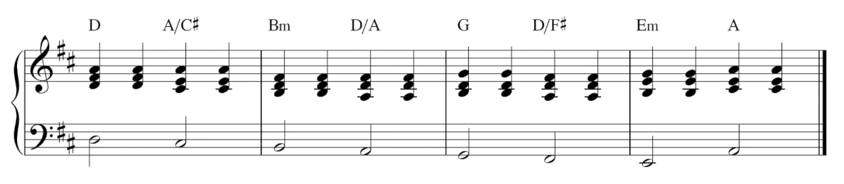 這個曲子是 D 大調的。如果使用最正常、最一般的流行音樂副歌的和弦進行的話,聽起來應該會像是這樣子: