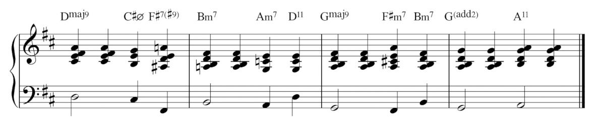 - 最後的 F#m7 和 Bm7 是 D 大調的的三級和六級;技術上來說跟上兩個地方的原理不一樣,但是有類似的效果。