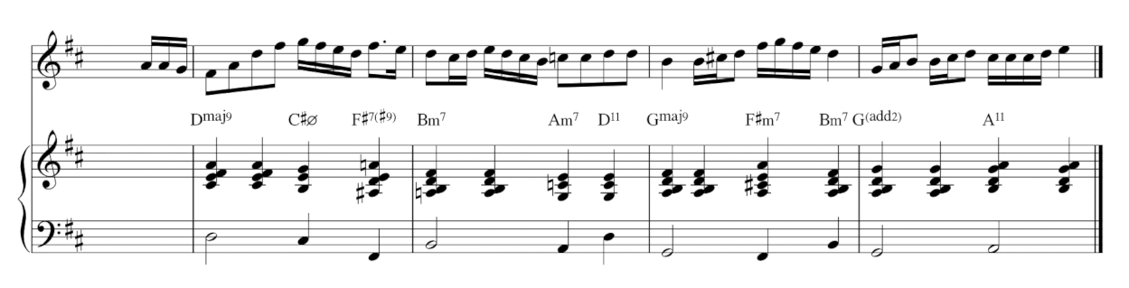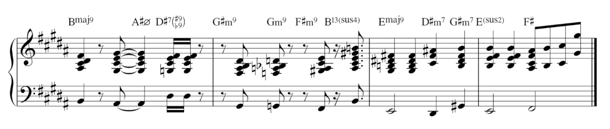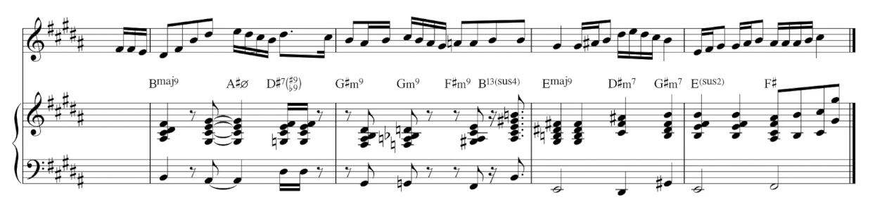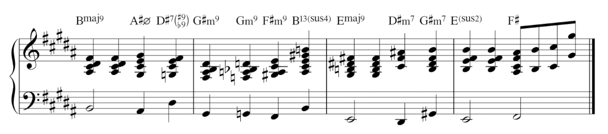 其他地方的和聲進行基本上都跟前段一樣,只是好幾個地方換成了複雜度更高的和弦而已。聽聽看效果: