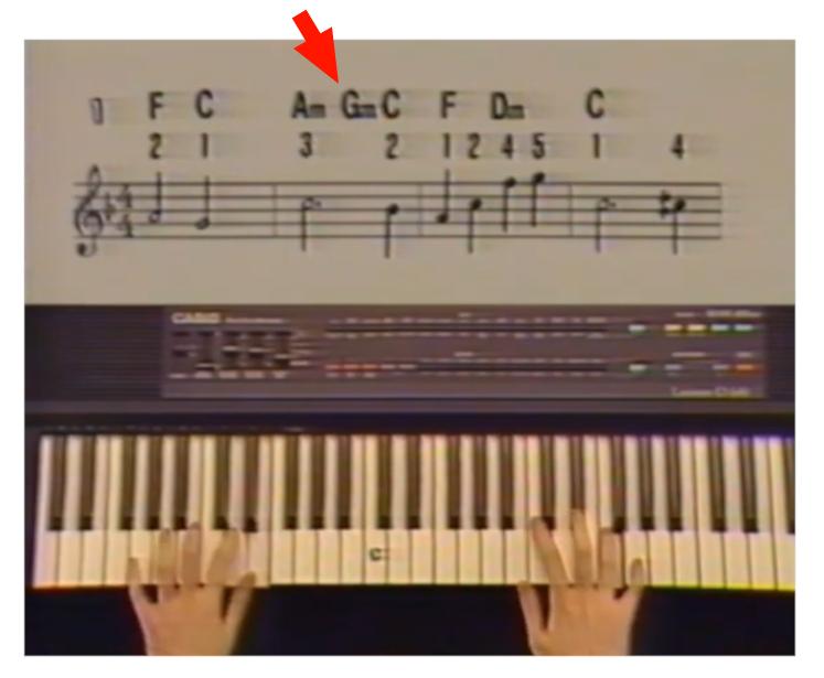 (順帶一提,這台 Casio 電子琴的和弦輸入有一個簡易模式:要彈 Gm 的話,只需要左手按 G 跟它右邊的一個鍵就可以了。所以上圖中她左手按的是 G 和 A 兩個音。)