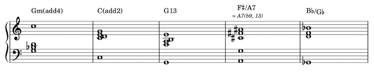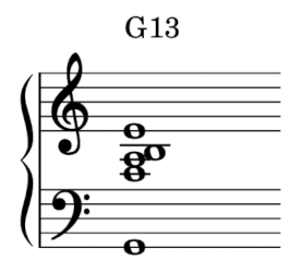 後來,我開始接觸爵士和聲之後,有一段時間很喜歡 G + F A B E 這個特定的屬 13 和弦配置。