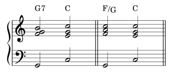 然後,第一次知道 F/G 可以當五級和弦用的時候更是震撼。我竟然可以不要用 G7 這種呆呆的、像是哈農終止式的東西?太棒了!