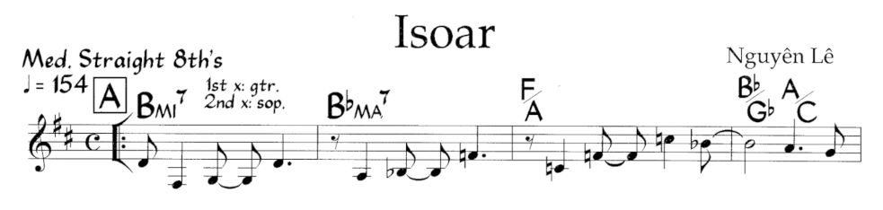這兩個和弦是我在阮黎(Nguyên Lê)的 Isoar 這首曲子裡聽到的。原曲的第一句大約像是這樣子: