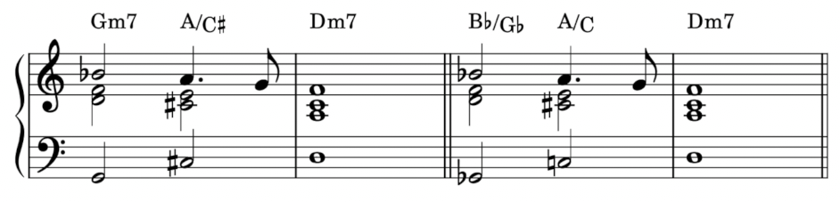 這兩個和弦完全違反我的常識。因為依照正常的寫法,這邊應該要放 Gm7 和 A/C# 才對;但他卻硬是把這兩個低音直接再降半音,變成 Bb/Gb 和 A/C!