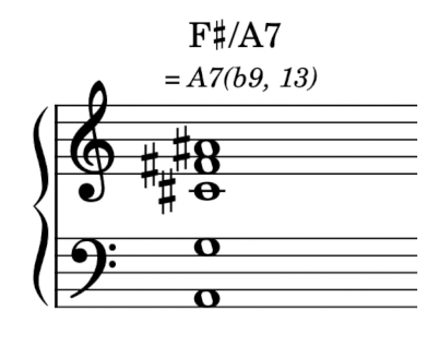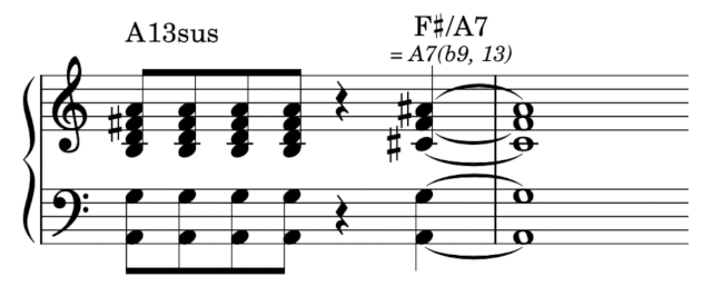 更後來我很有印象的是,有一段時間很喜歡各種「上層結構」(Upper Structure)和弦,也就是把看似不相關的三和弦疊在屬七和弦上面。譬如像這樣,把 F# 大三和弦疊在 A 的屬七和弦上面。