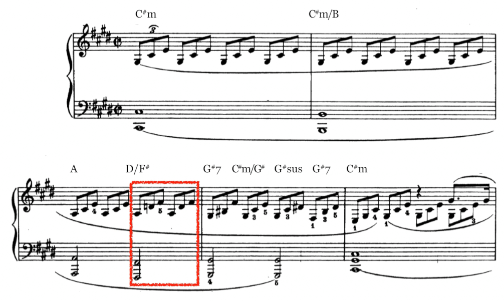 一個非常有名的例子就是貝多芬的《月光奏鳴曲》第一樂章。這首曲子是 C# 小調,裡面有個 D/F# 和弦就是拿坡里和弦。