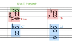 以上就是如何在副屬和弦前面,再插入一個二級和弦來裝飾的技巧。學起來之後,也在自己的作品或即興中用用看吧!
