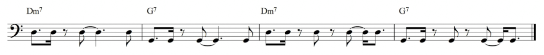 讓我們用一個很單純的設定的示範:Dm7 和 G7 兩個和弦來回切換。當你拿到這樣一個段落,需要幫它編一個 Bass 聲部,可以怎麼寫呢?這當然要看那首曲子的需求而定,不過我在這邊可以給你幾個簡單的思考方式。