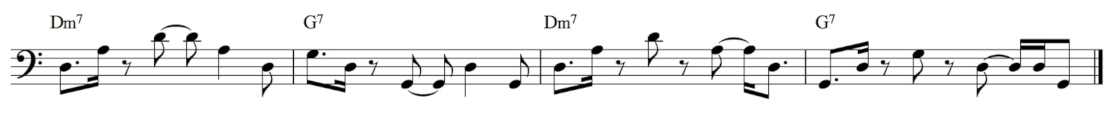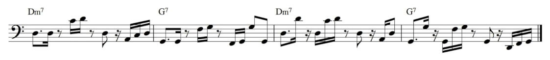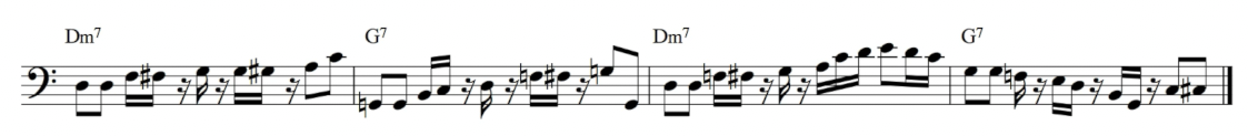 接著可以考慮把七度音也放進來。Dm7 的七度音是 C,G7 的七度音是 F。七度音的加入會讓整個低音線條更有旋律性,不再只是上下跳來跳去,也多了更多排列組合的可能: