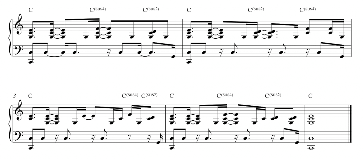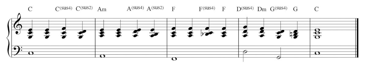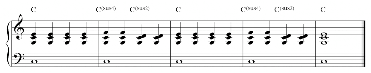 比較一下,如果我們真的把 C 和弦原封不動地拉長四小節,整體的感覺會比較呆板。但是加入 sus4 和 sus2 和弦之後,即使和聲功能上還是停留在 C 和弦,聽起來卻會有更多的動態和流動感。
